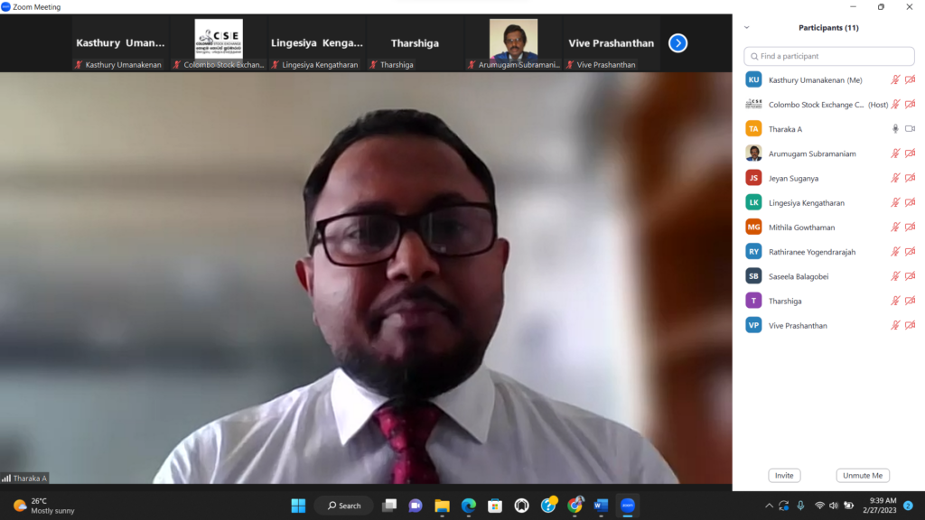 An initial discussion was held between the Department of Financial Management, University of Jaffna and Investor Education Unit of Colombo Stock Exchange on 27th of February 2023 at 9.30 a.m